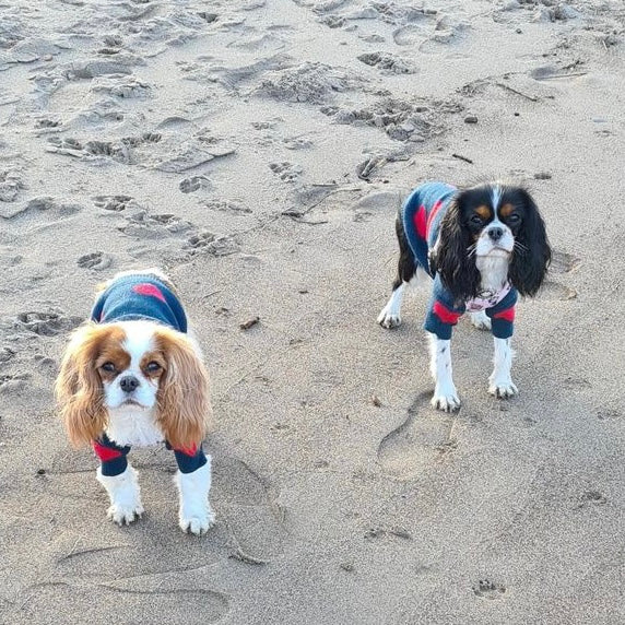 Having a super fun time at the beach, Coral and Autumn are sporting their matching Teal Hearts Jumpers - both size small.
