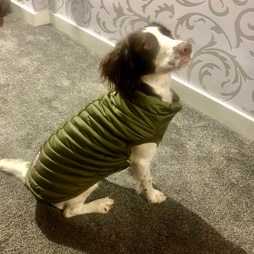 This is Bailey, looking super smart and raring to go in his Khaki Woody Puffer Jacket. Size XL provides the perfect fit!