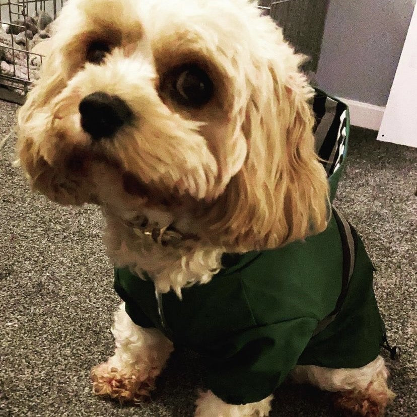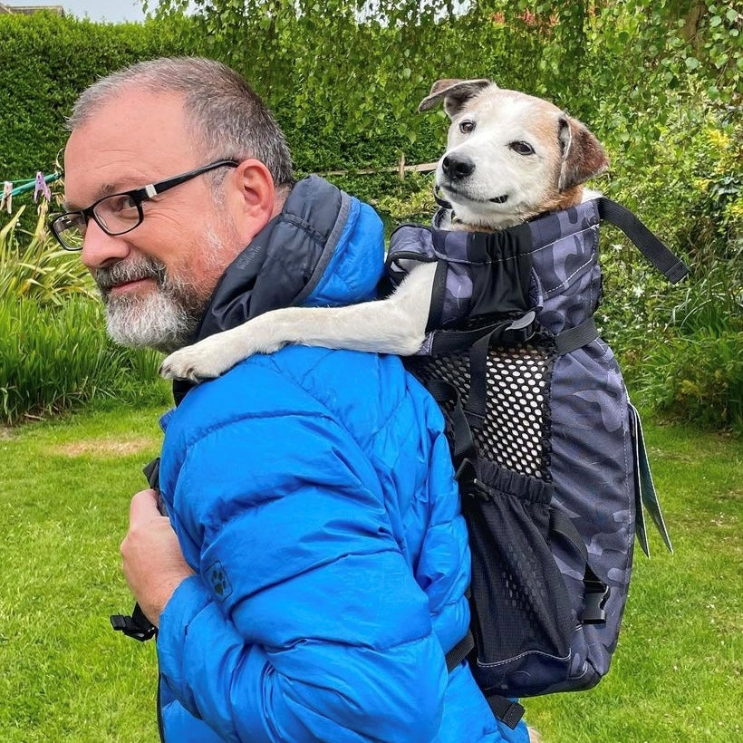 Celebrating his 16th year, Charlie is looking super comfy and happy to join his pack on longer walks whilst giving his little legs a rest.