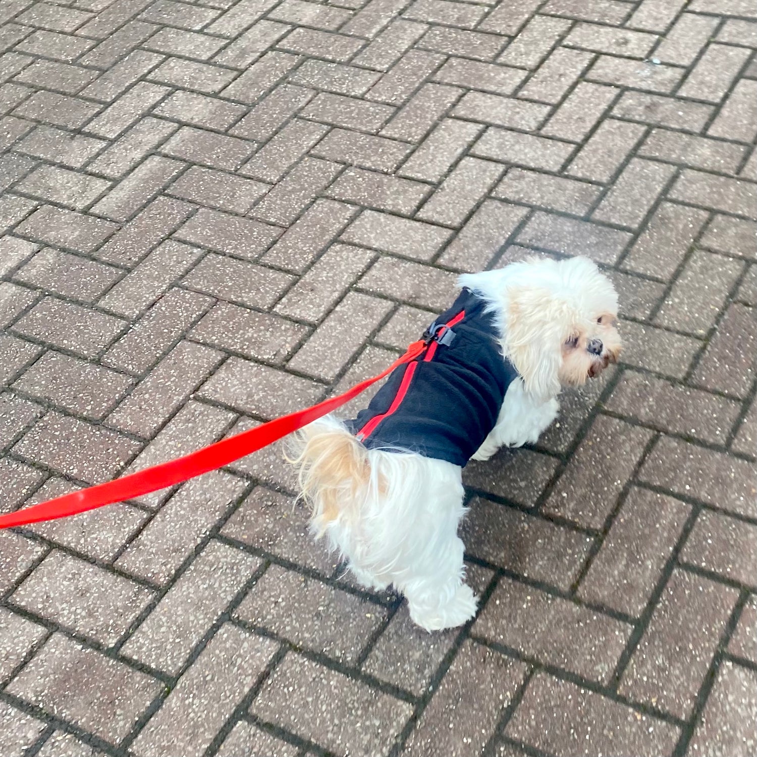 Pip's looking super stylish in her black Zip & Clip fleece (size medium) paired with our Candy Red Waterproof Lead.