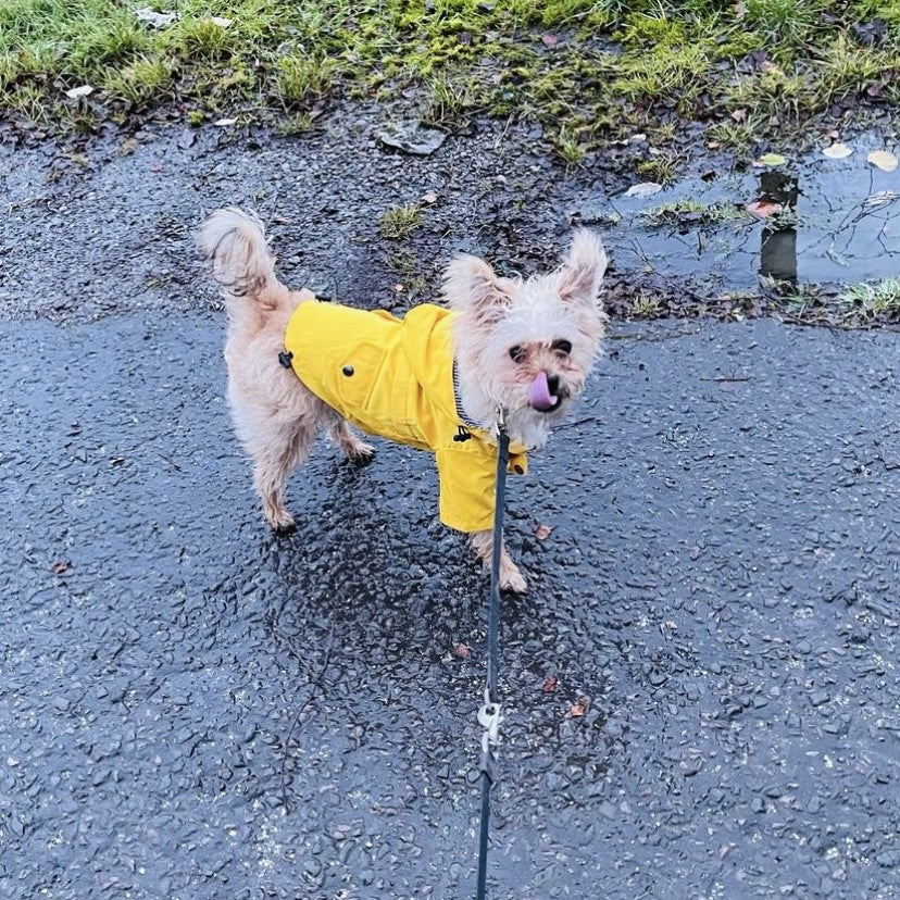 Here's Tilly looking chic and ready to take on the drizzle and snow in her new raincoat. She's wearing a medium, which fits her little legs perfectly!