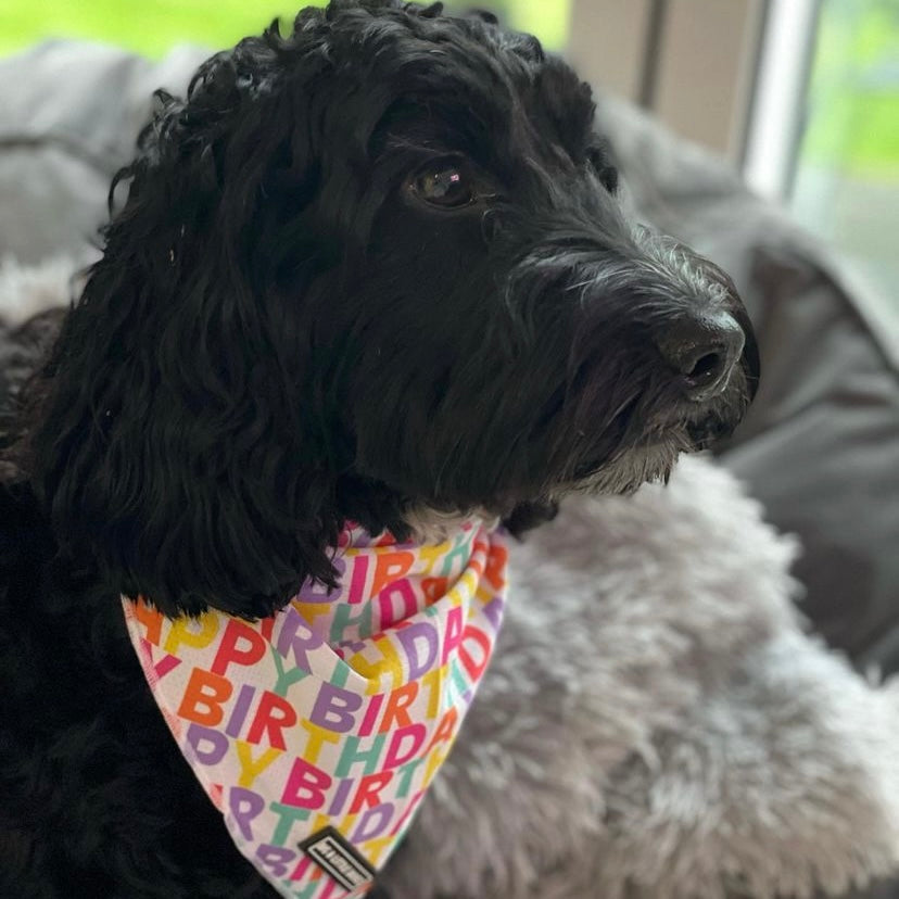 The lovely Betty Boodles celebrated her first birthday in style with our Happy Birthday bandana (size M/L) and a yummy Scoff card.