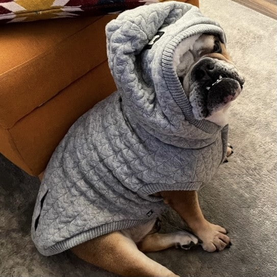 This is the adorable Max, looking super cosy and ready to brave the cold wearing an XXL in our Sherpa fleece lined grey Maxi hoodie.