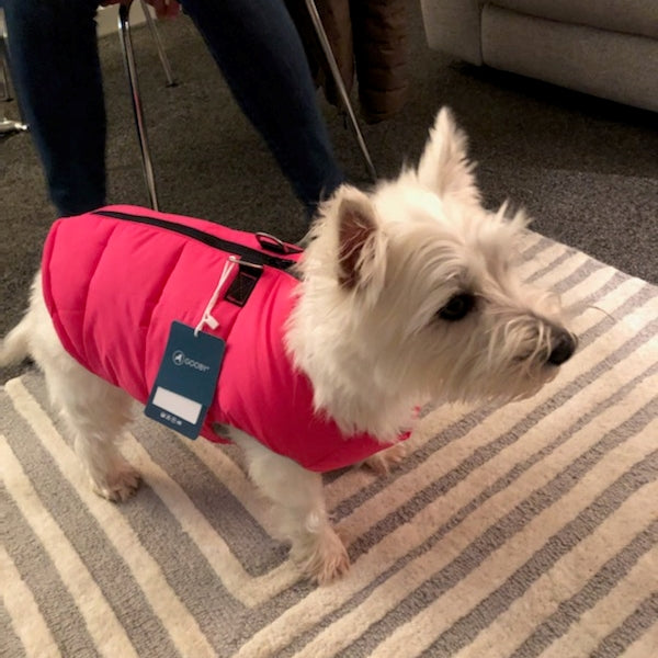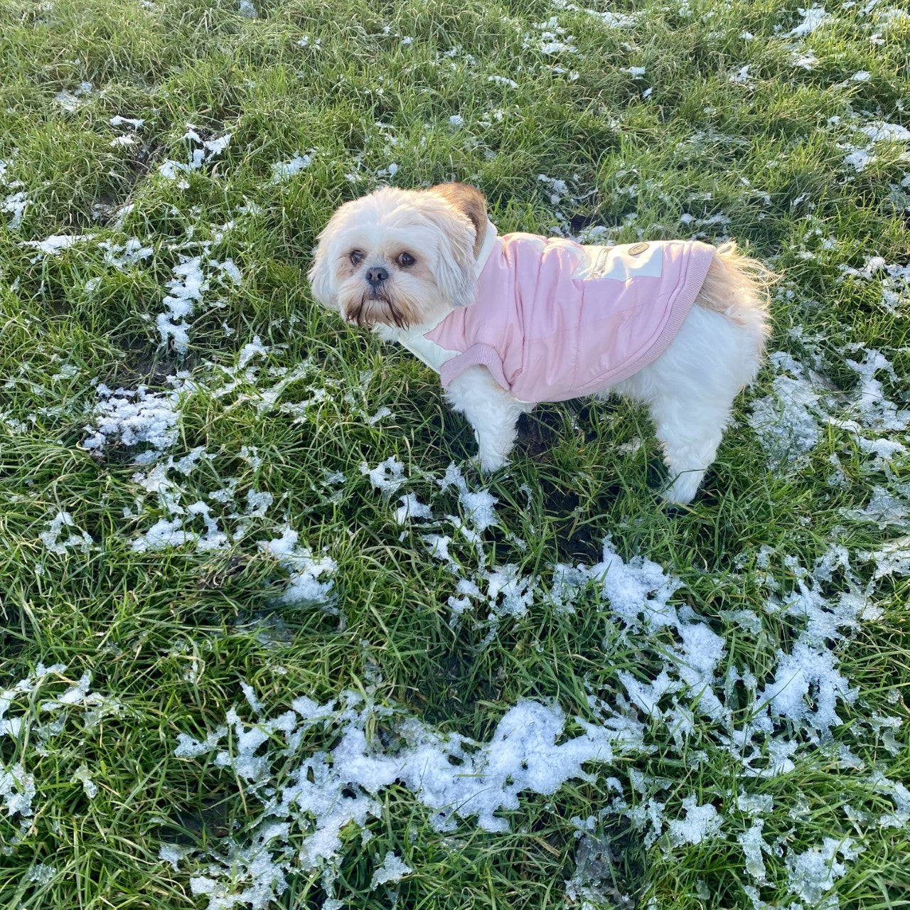 Here's little Peggy looking lovely and warm despite the wind and snow, wearing a size medium Pink Quilted Puffer.