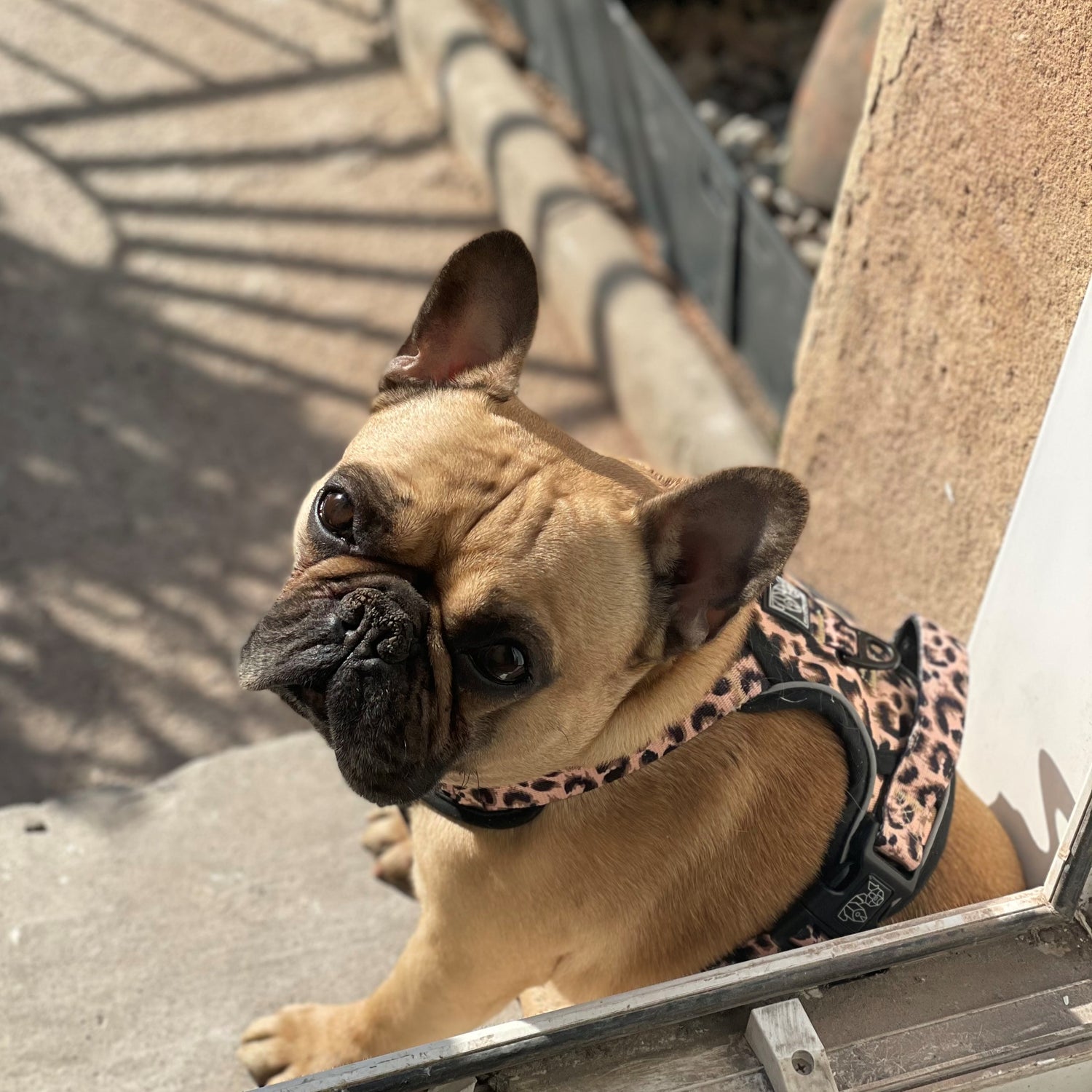 Ahh, look how happy and stylish Sidney is, chilling on the doorstep enjoying the sunshine! Sidney’s wearing the leopard print harness in a size medium.